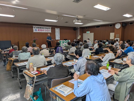 1時半には広島に着き、コンビニでメモ帳もゲットする。会場の「ロードビル」に突入し、2時から「女性9条の会ひろしま」の企画に加わっていく。各国との平和交流にもふれた楽しく軽やかなうたごえの時間があり、主催者からの訴えのあと、こちらもサクサクしゃべっていく。盛り込みすぎでちょいと時間オーバー。楽しんでいただけたようではあったが、しかし、時間は守っていかないと。最終92人のご参加だった。