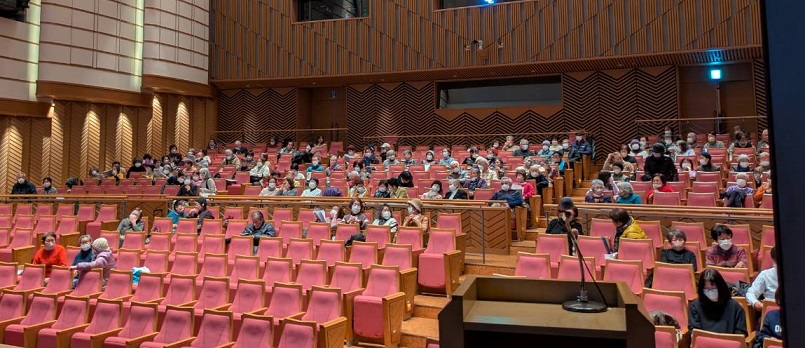フロアのみなさんは見事にゆとりをもっての分散着席。100名ちょいのご参加だった。