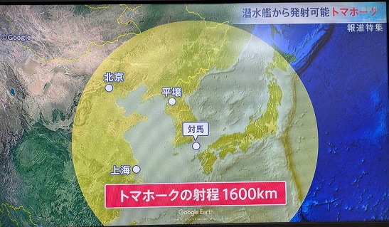 5時半には店を出て、ちょいと買い物をして6時に家に帰っていく。ネット情報をカシャカシャやって、7時には簡単ごはんをパクパクパク。報道特集にはトマホークの射程距離の図も。こんなミサイルを大量配備すりゃ、中国とも北朝鮮とも軍事的緊張が高まるのは当然だ。