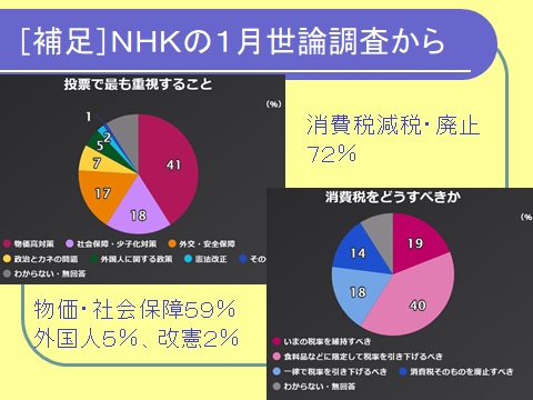 こちらはこの総選挙に向けてのデータ。消費税減税・廃止への願いは強く、投票で「外国人問題」を最重視する人は5%だけ。