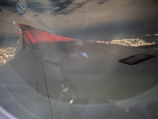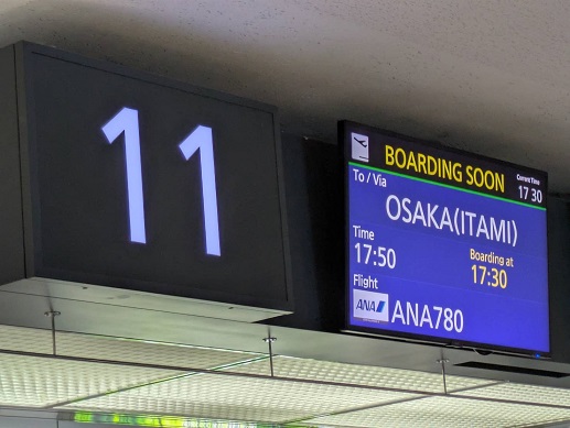 たくさんの修学旅行生も同乗したが、特ににぎやかな様子もなし。おそらく旅行の最終日ですでに十分疲れていたのだろう。こちらは「陰謀論の人」「明日のパワポの人」となって移動する。座席は翼の真上だったが、前後に見えるのは大阪の街。