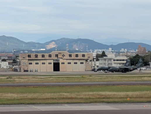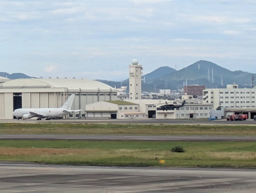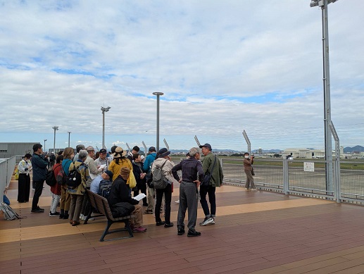 中央の1本の滑走路の向こうに自衛隊、手前に少数だが民間国内線(ほとんどは中部国際空港に移動した)のための施設がある。しかし民間機の離着陸の管制も自衛隊が行なっており、わずかの民間機の存在はむしろ空港全体を「自衛隊基地」と見せないためのカモフラージュに見える。展望デッキで、愛知県平和委員会のメンバーからいろいろな解説もうかがっていく。