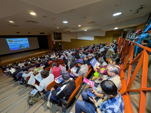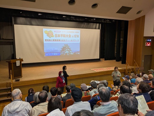 2時前には「豊山町社会教育センター」ホールに移動して、愛知県の軍需産業について学んでいく。8台のバスの同時移動はなかなか大変で、全員集合までの空き時間に、全国の取り組みのミニ交流会も自発的に。