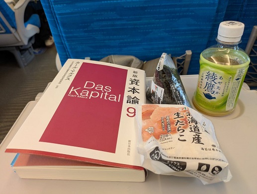 車内「資本論の人」からコンビニおにぎりの人へと変態しながら移動する。「金山」のイオン前に12時半の集合なので、お昼を食べる時間はないのである。